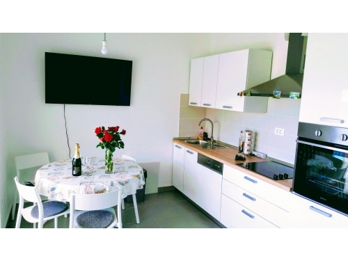 Modern eingerichtete Wohnung mit großer Terrasse und offenem Meerblick, besteht aus drei Schlafzimmern, Küche mit Essecke und kleinem Wohnbereich, Badezimmer.