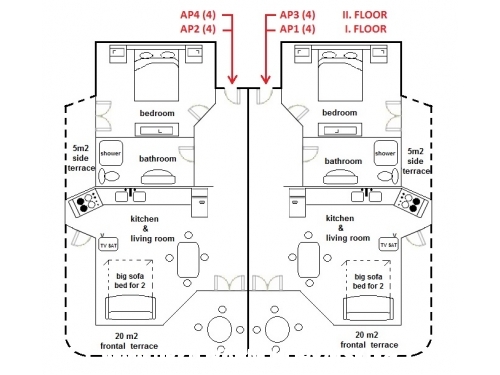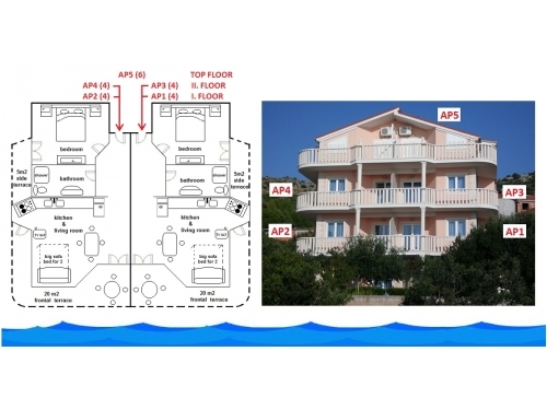 Villa Marija hat 5 modern eingerichtete **** zertifizierte Wohnungen, 4 Appartements sind für 4 Personen und 1 Wohnung im Dachgeschoss für 6 Personen geeignet. Gesamtkapazität von 22 Personen. Alle Wohnungen haben Terrassen mit großem Meerblick. Für große Gruppen oder Aufenthalte länger als 2 Wochen können wir Rabatt auf die Preise genehmigen!
