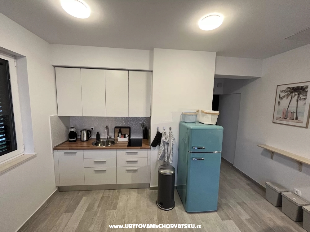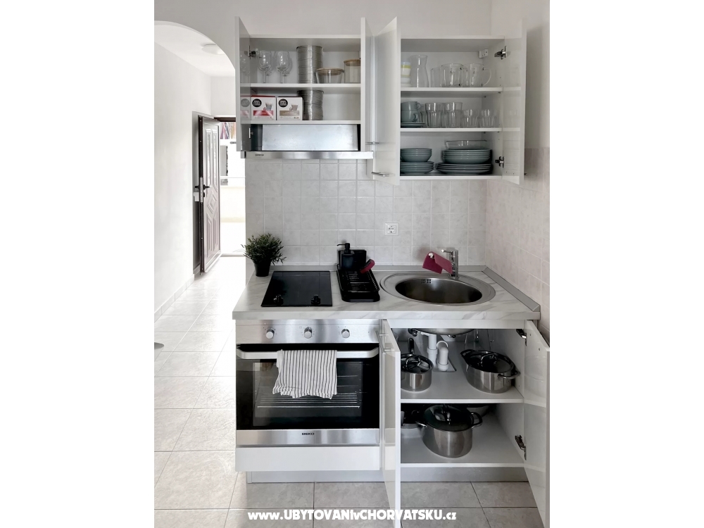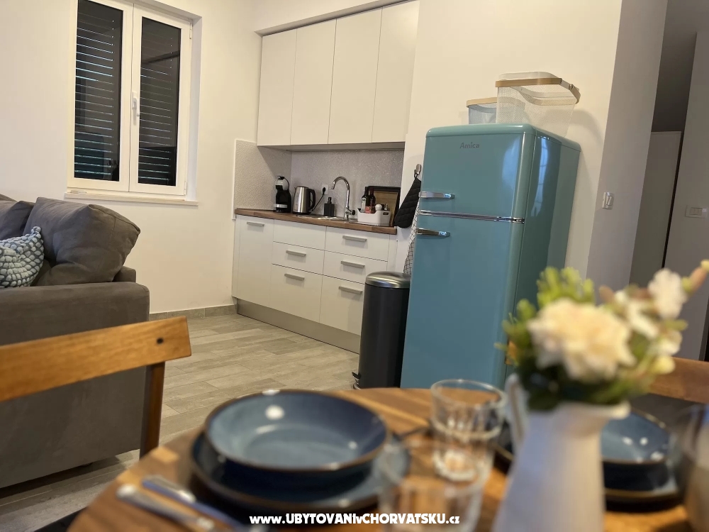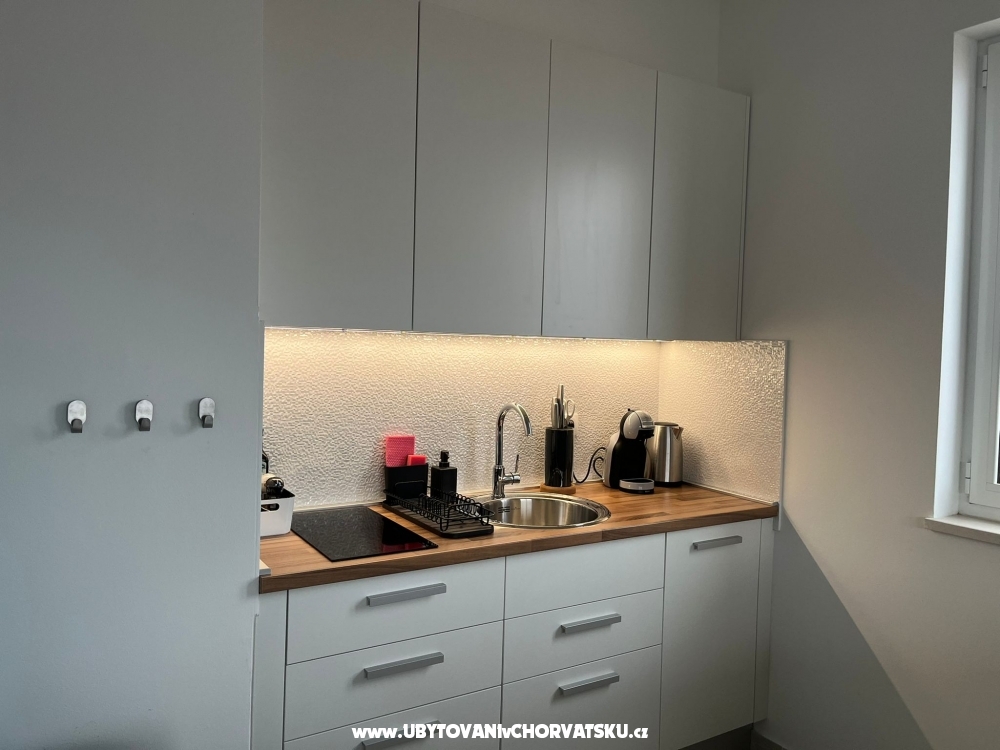 Im Erdgeschoss der Villa finden Sie einen Raum mit Küche und einen Tagungsraum, davor gibt es einen Grill und eine Sitzecke im Schatten der Pergola. Dieser Bereich steht allen Gästen der Villa zur Verfügung. Die Küche verfügt über eine professionelle Kaffeemaschine mit außergewöhnlichem Kaffee, einen Kühlschrank und eine voll ausgestattete Küche mit Backofen, Mikrowelle, Herd und Geschirrspüler. Der Gasgrill im Freien beschleunigt die Zubereitung von Mahlzeiten. Sie können auch den typisch kroatischen Ofen nutzen, der gleich um die Ecke ist. Wenn Sie es mit Holz und Holzkohle erhitzen, können Sie Köstlichkeiten auf echtem Feuer zubereiten und Feinschmecker können sogar Oktopus unter dem Ofen backen.