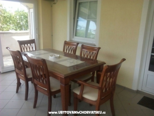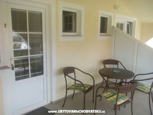 Parkplatz im Schatten, Grill im Freien mit Tisch, Stühlen und einem Kühlschrank.